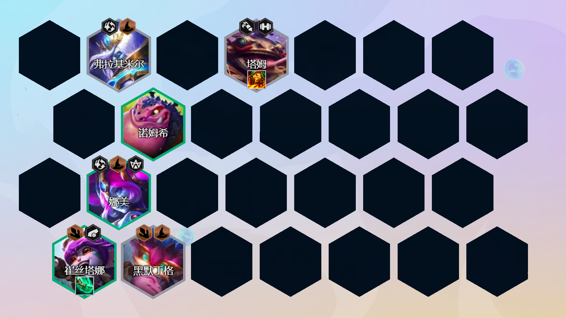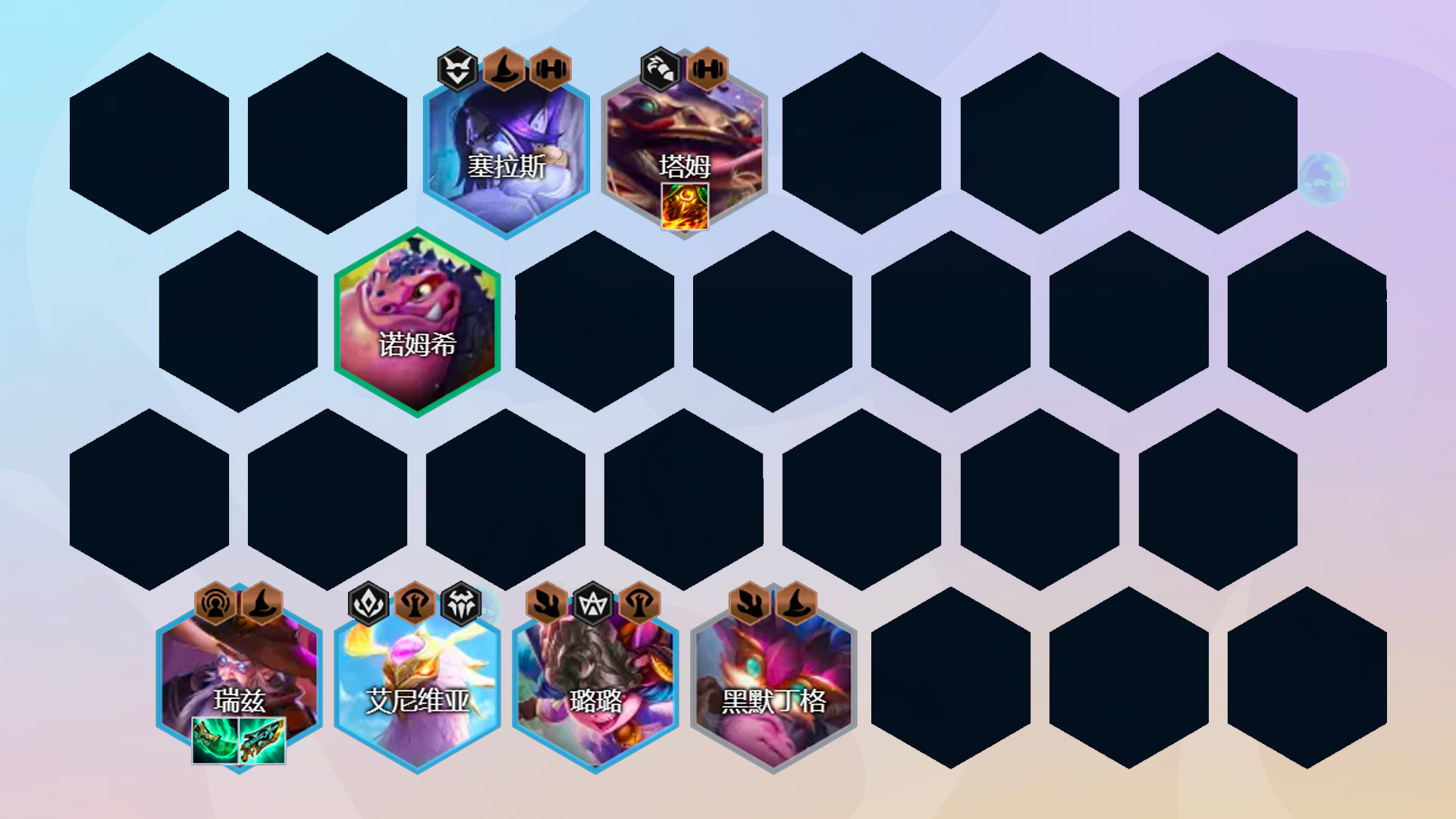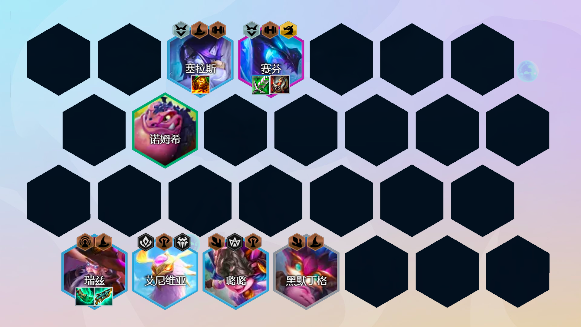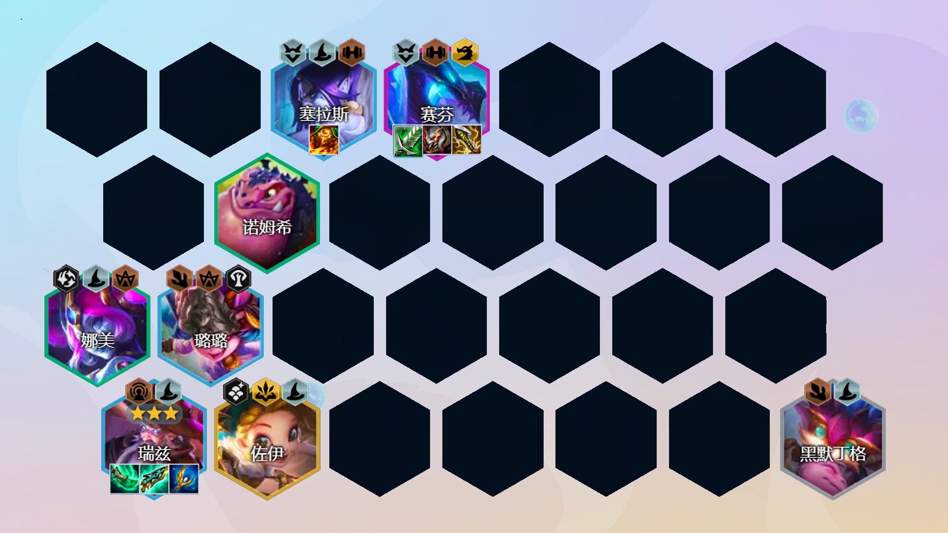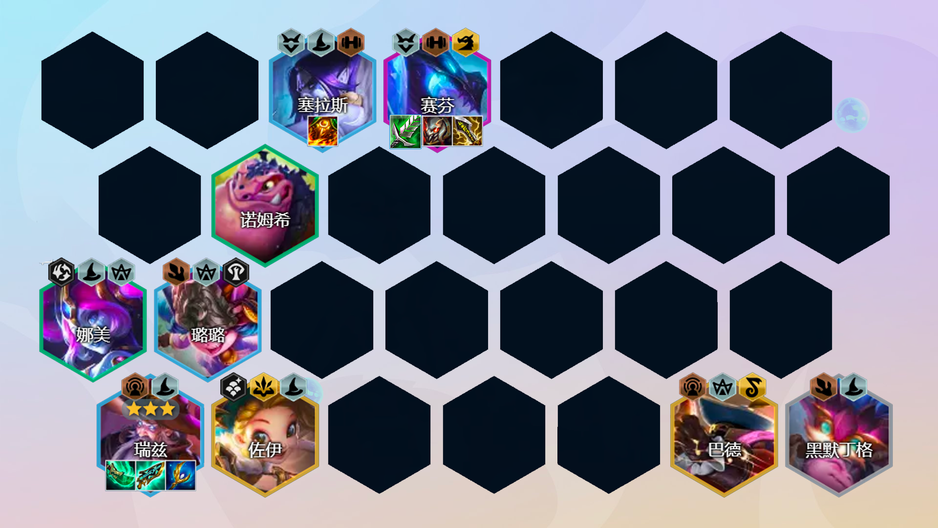 阵容组成:黑默丁格、娜美、塞拉斯、璐璐、赛芬、佐伊、巴德