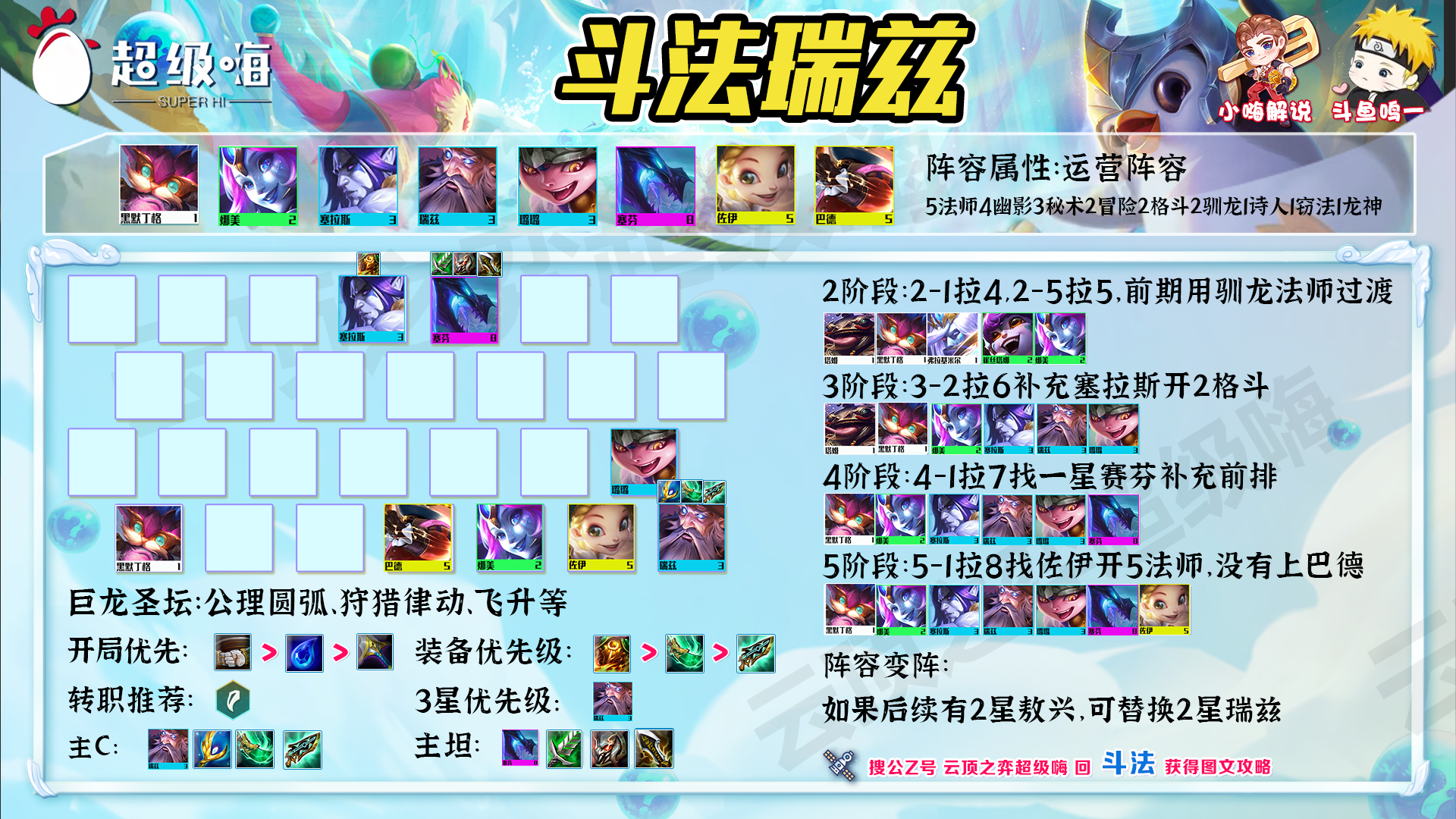 阵容羁绊:5法师4幽影3秘术2冒险2格斗2驯龙1诗人1窃法1龙神