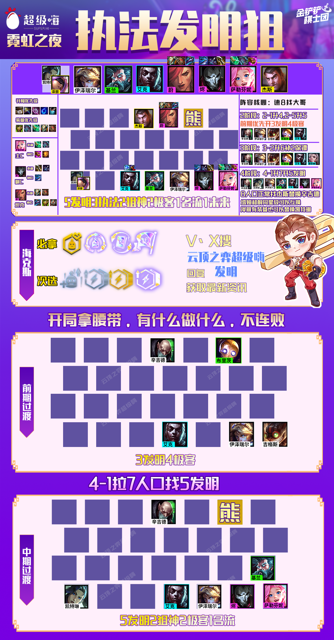 运营思路:这是一套速8的阵容体系,前期2、3阶段可以利用发明家体系打质量连胜。发明家在前期是一个强势期,只是在4阶段没有拉8人口找到杰斯和高费卡的情况下处于弱势几个回合,其他都是属于强势。