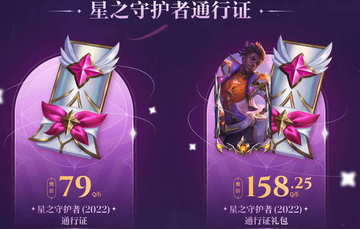 玩家可开启的分为:星之守护者(2022)通行证(79Q币)和星之守护者(2022)通行证礼包(158.25Q币)——礼包包含:星之守护者(2022)通行证+皮肤【星之守护者 艾克】(7.5折)+图标(含载入边框)
