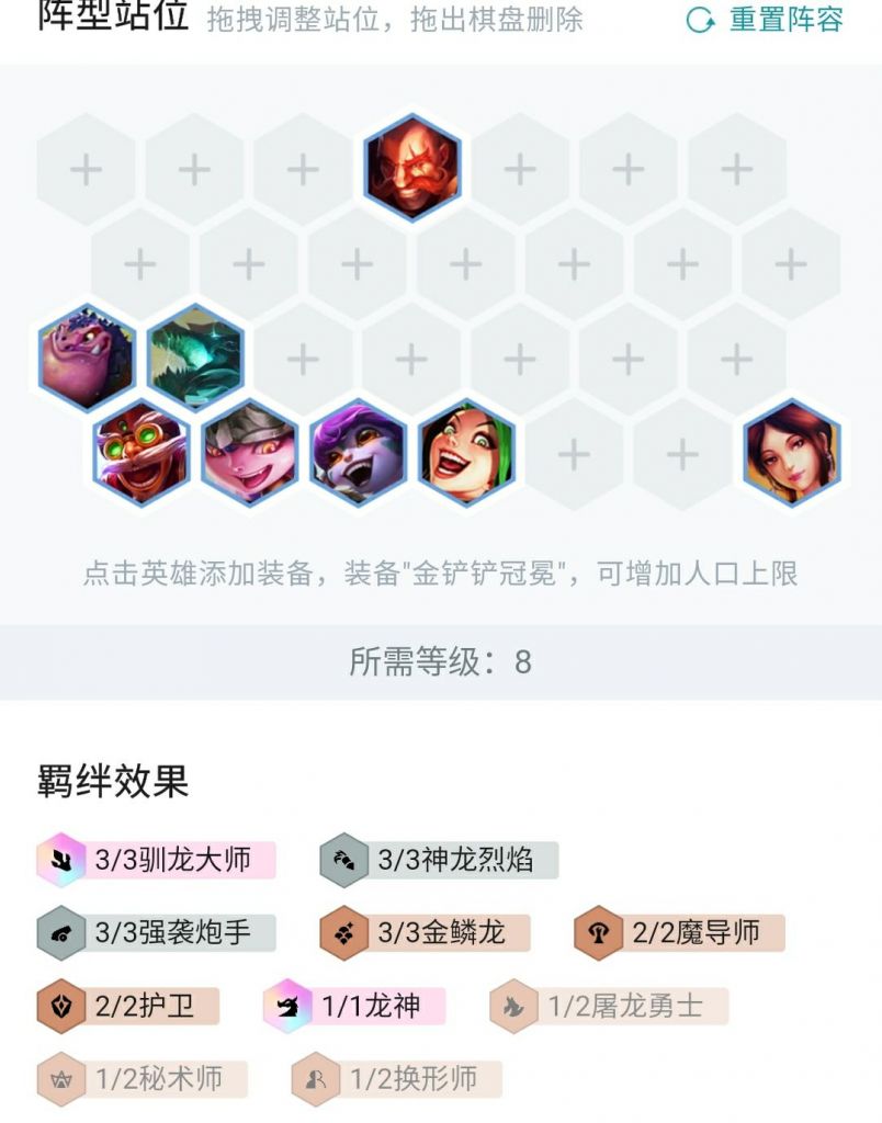 主要取决于发牌员给你发了个什么牌。四人口主要思路为2前排+2后排,不拘泥于体系内的牌过渡。前排两格斗两护卫均可,后排可以用两射手/两炮手/两驯龙过渡。上5上6按羁绊补充即可。装备能合就合,这套不挑装备。