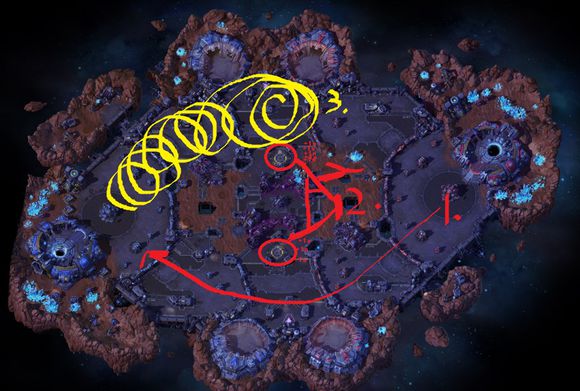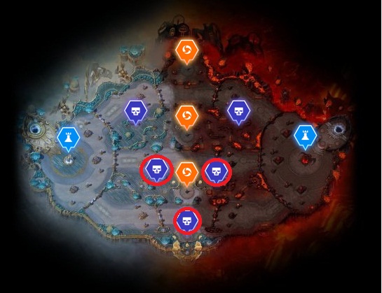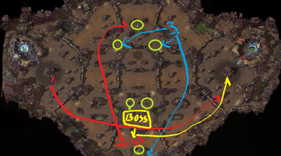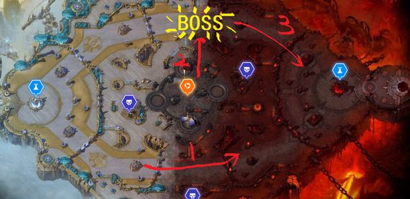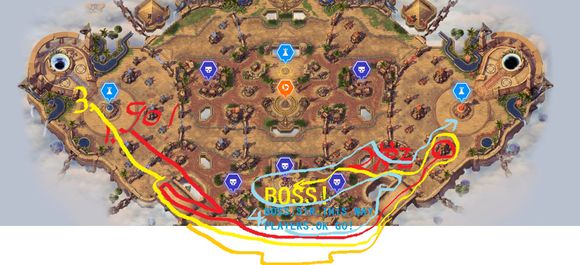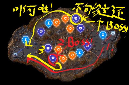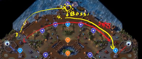 1.红线推到水晶 2.炉石泡泉3.黄线打BOSS,队友不配合希尔瓦纳斯,雷克萨2人可打。4.和BOSS一起推