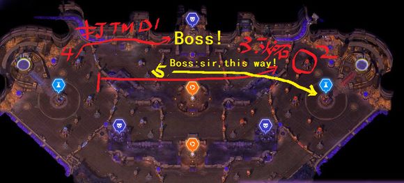 这时候BOSS会去建筑较多的一路也就是上路,然后随着BOSS一路推过去,就完成了比赛。