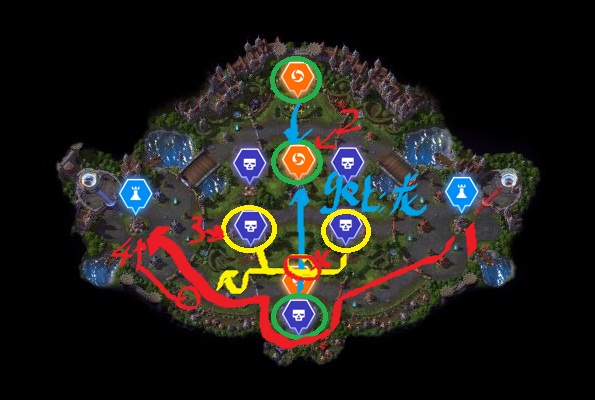 1.红线推下路,到水晶门口2.刷龙了去抢机制,绿色,中间获得龙3.有龙的同时可以去黄色拿4个远程小乖。4.在红圈处集合然后一波。