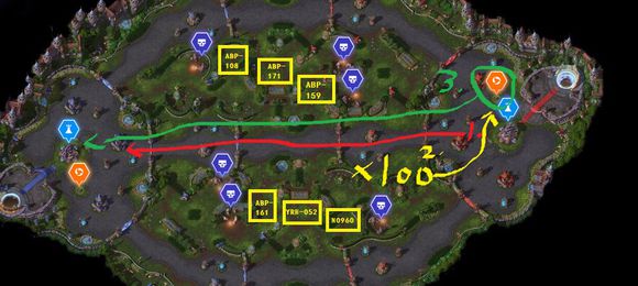 如图 先从下路推过去,打到水晶的时候会刷机制,然后希尔瓦纳斯转到上路先去推塔,其他队友去打机制BOSS