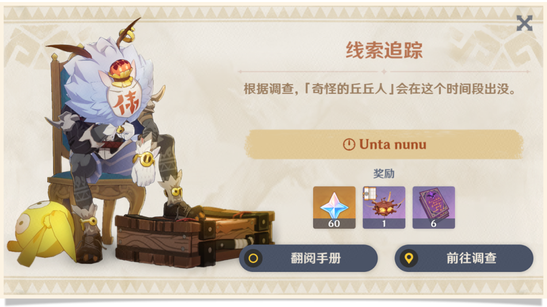 但是大家要注意一点,【折箭觅踪】的活动,额,和之前寻找宝钱的活动类似,一共分为7个地点,只有击败了其中一个地点的丘丘人,才能解锁下一个地点的位置,关于奖励方面,还是60原石和一些经验书以及尘歌壶内的装饰。而且因为要和丘丘人交流,活动期间内,会有一本【丘丘语速查手册】给大家准备好,不过提到丘丘语,其实我最先想到的是艾拉-马斯克。