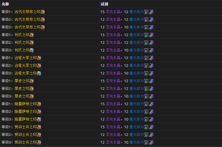 幻象之书:德拉诺(收集霜狼之印与雷神之印的武器附魔外观):时光水晶(20),巫术之气(10),巫术之水(10),狂野之血(15),轻羊皮纸(3)