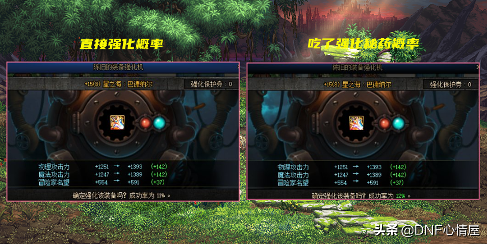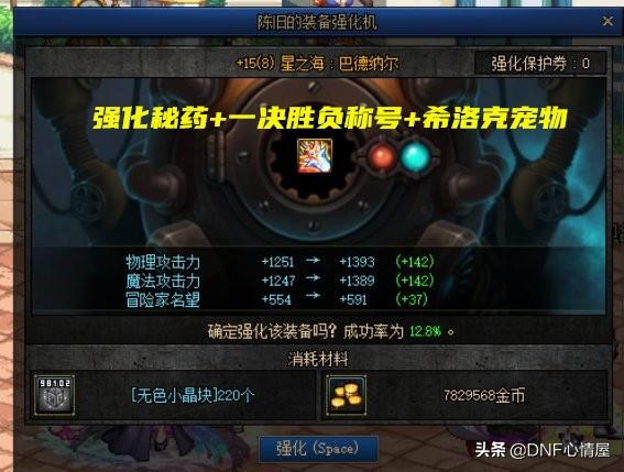 没有用强化道具时,+15星之海光剑往上丢,成功率仅为11%,失败的概率超大。当你吃了强化秘药,成功率发生变动,在界面变成12%。当强化秘药+凯丽称号,成功率会成13%,能够提升1%。