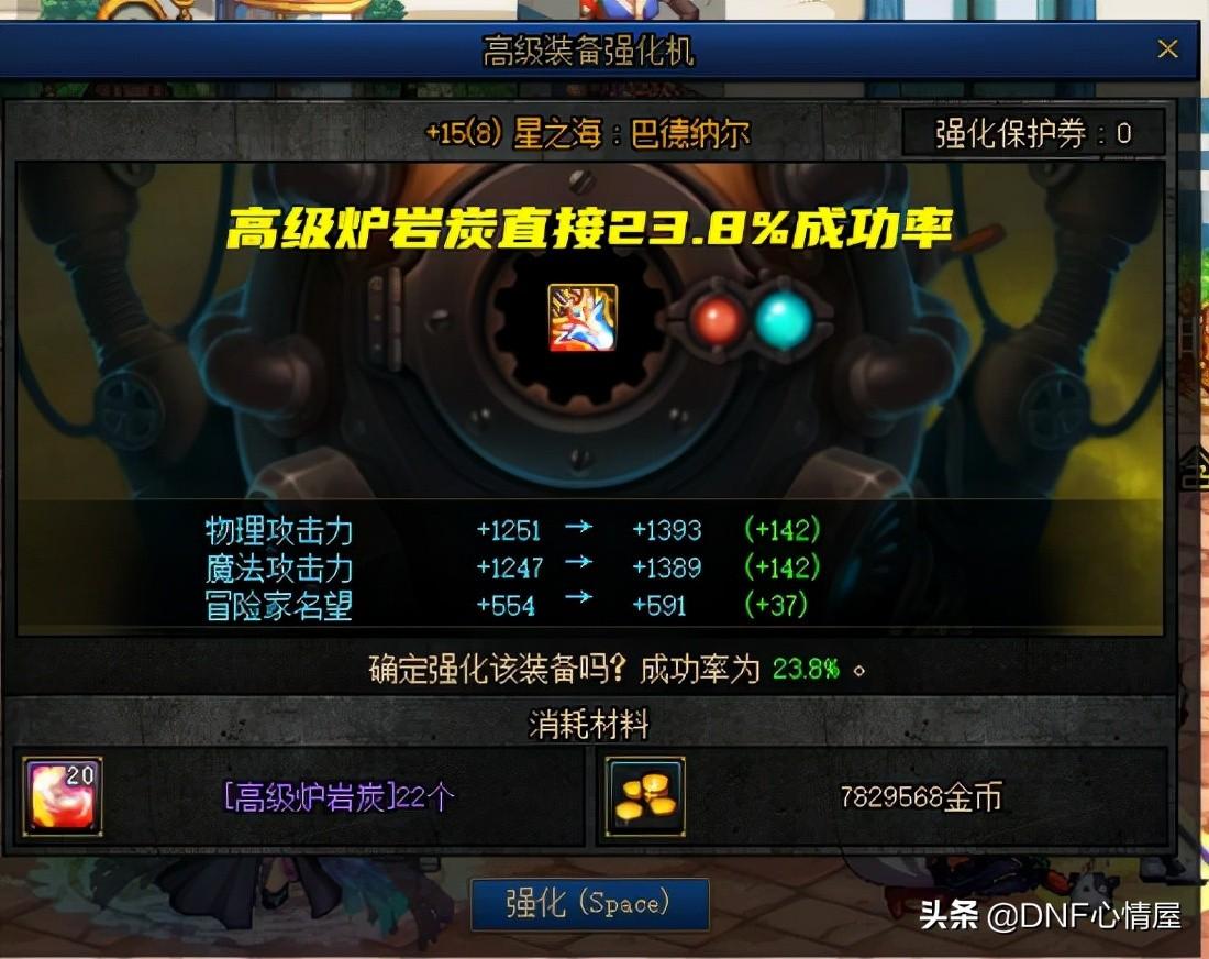 关键的东西来了!吃了“高级炉岩炭”道具后,在强化秘药+凯丽称号+希洛克宠物前提下,成功率直接给提升至23.8%。那么能意味着,高级炉岩炭这个强化道具,加算提升10%概率!要强化高强武器时,高级炉岩炭必备,成功率提升不可小觑。