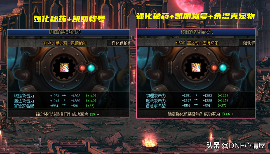 当然对于凯丽的称号,也都告诉你了,当佩戴后能增加1%强化几率,这属于加算形式。强化秘药+凯丽称号+希洛克宠物后,界面显示的成功率,变成了13.4%。由此可见希洛克宠物,这是乘算的效果,仅仅提升了0.4%而已。
