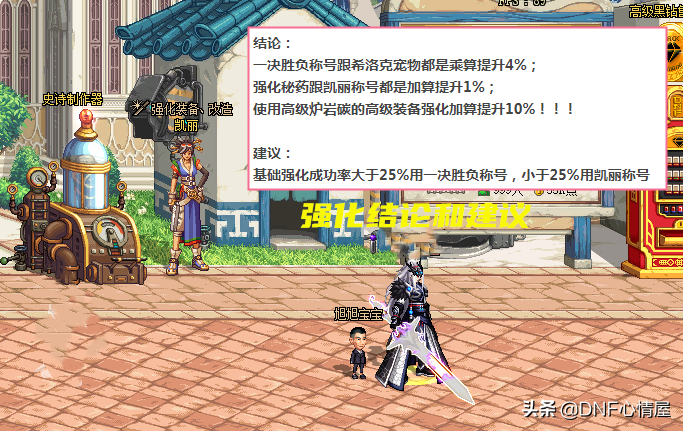 但玩家要注意了,并非凯丽称号是加算提升1%,就全程使用这个!当基础强化成功率大于25%时,用一决胜负称号,在成功率提升方面,要比凯丽称号好一点点。反之基础强化成功率小于25%时,就使用凯丽称号,比一决胜负要强点。