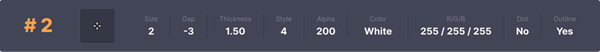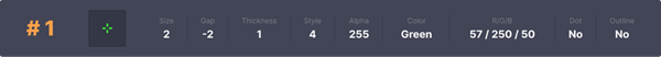 (笔者注:由左向右,size指准星大小;gap指准星中心的空隙大小;thickness指准星线的粗细程度,style指形状,Alpha指透明度,color指颜色,R/G/B指RGB数值,dot指中心的点,outline指准星轮廓线。)