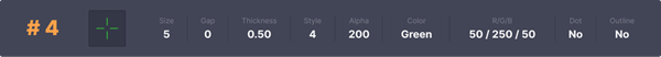 显然,绿色、青色、红色这种与环境对比度高的颜色是最受欢迎的。大多数的玩家都不会在准星中设置点和轮廓线。