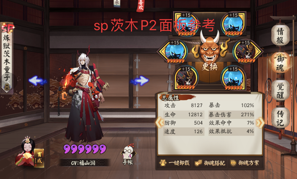 这套阵容的式神技能要求跟上面一套是一致的,主要是注意铁鼠的面板,攻击不能太高,不然容易将小怪的血量压到破势线以下,导致sp茨木的面板需求过高。