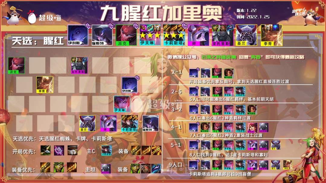 前言:福星临门版本即将上线,今天小嗨就给大家介绍一下版本最稳定的上分阵容——九腥红加里奥。