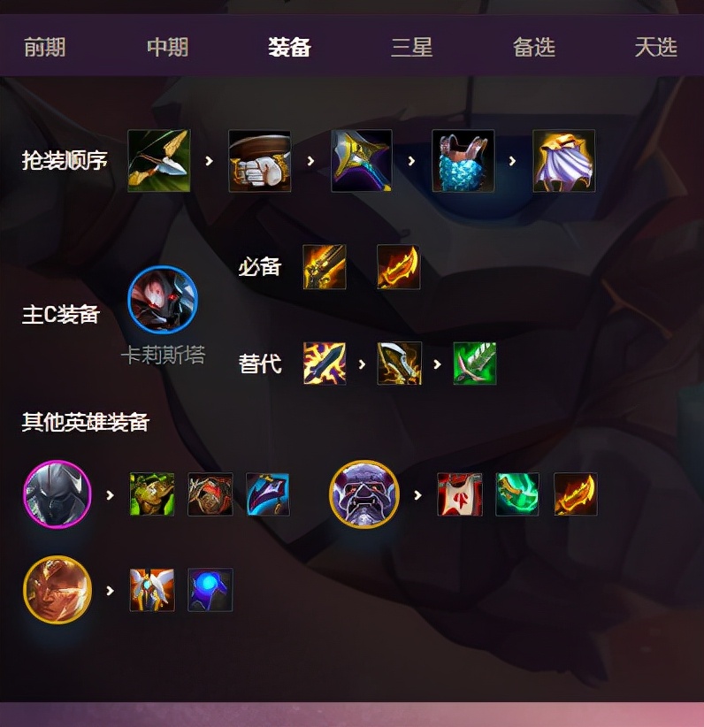 建议:后期阵容如果没有3星卡莉斯塔的情况下,可以直接去卖了1费天选去追3星5费,或者大成九五阵容。这里小嗨建议可以将腥红阵容作为过渡的卡牌,如果后期战斗力不足的情况下九五阵容是版本最强过渡。