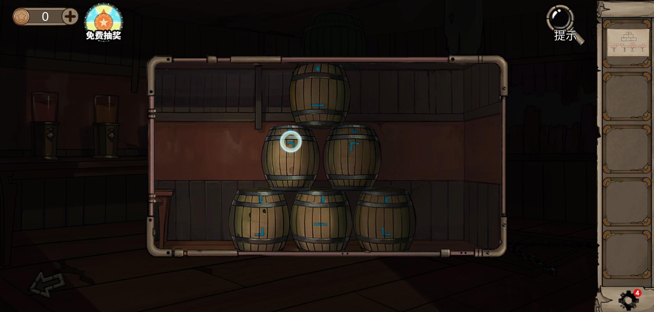 003房牛头位置的刀,再用梯子得002房的羊皮用来缝鼓,地窖用心形钥匙得到水管。用酒曲造酒,只需按照提示左边拉绳,和红绿蓝三个按键运动到红条处按下即可,得到装满酒的酒缸。