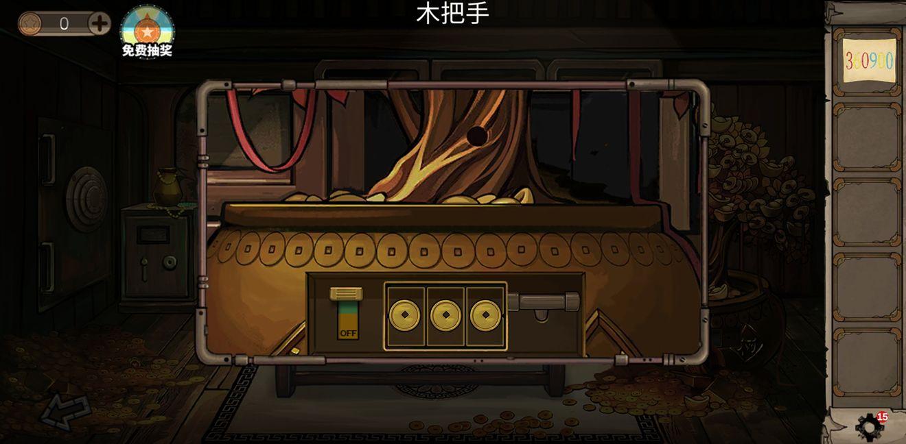 点击摇钱树的花盆,将把手放入孔中打开,再把左边的按钮调到“ON”,点击数字,调成你想调的数字,将金币(7)和美元($)摇出。