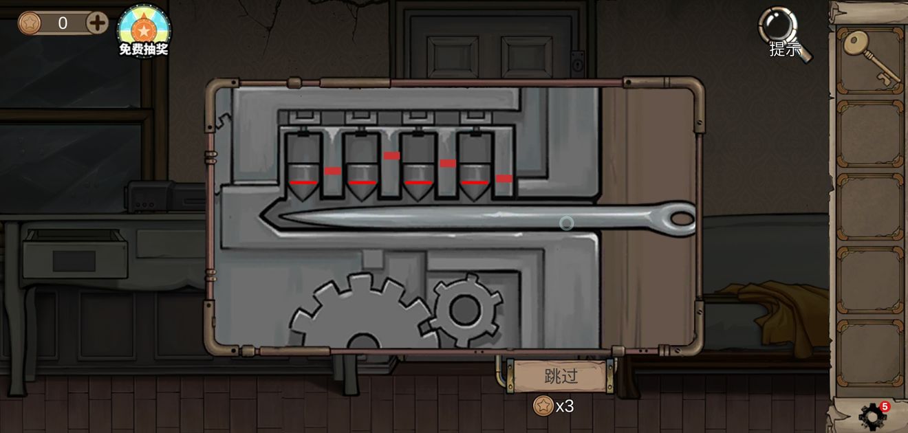 从桌子的右边抽屉的拿到针,放入第一个锁,掌握节奏点击针,让红线同时重合,即可开门出来。