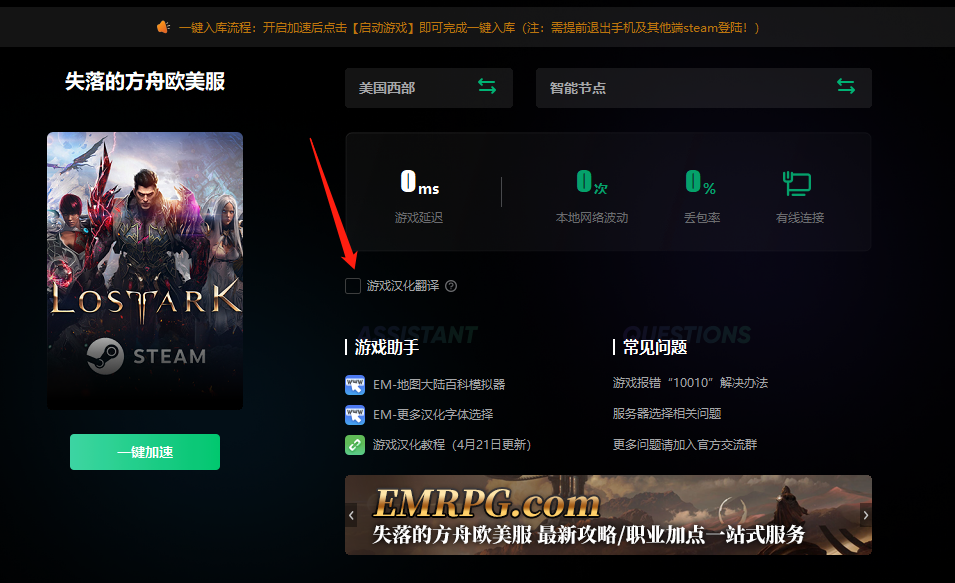 然后我们就可以对游戏进行加速了,加速的主要目的就是可以帮助我们解决失落的方舟在游戏的时候经常会遇见的卡顿延迟等问题,而汉化的方法就在奇游的游戏助手中,我们点击游戏汉化翻译。