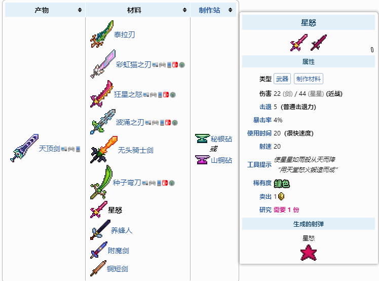 星怒可以说是战士流前期的神装,有普通的击退力不说,还能召唤星星从天而降,能照亮的同时还有伤害。在前期非常顶,只要拿到了基本就砍的过许多boss了。并且他也是战士最终毕业武器天顶剑的材料之一,可以说是战士必备的一把武器。但是星怒的寻找条件也比较苛刻。他只会在空岛上的宝箱中开出来。