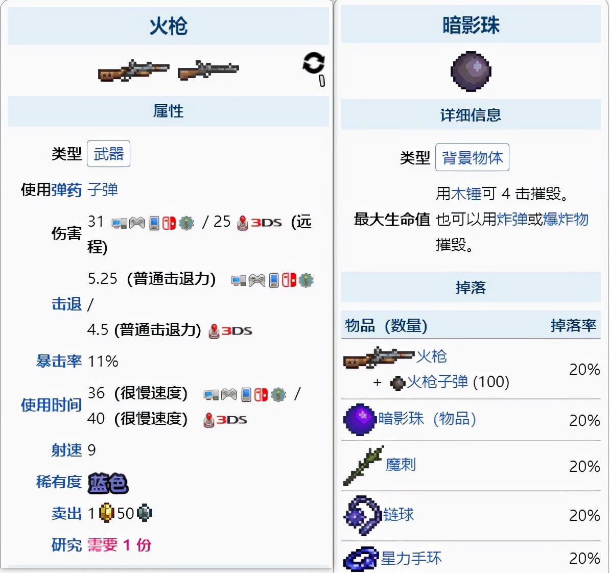 火枪可以说是泰拉瑞亚中前期最好用的强,在打肉山解锁困难模式之前,它的基础伤害是所有远程武器中第二高的,只比星星炮低。不过需要注意的是,火枪只有在腐化世界中才能拿到。火枪的获得难度相比星怒可以说要低很多,只需要去腐化地带中挖矿敲暗影珠即可。并且泰拉瑞亚中,玩家摧毁的第一个暗影珠必定掉落火枪和一百发子弹,可以说只要拿到了火枪,就算没有回忆药水,也有足够的火力杀回家。