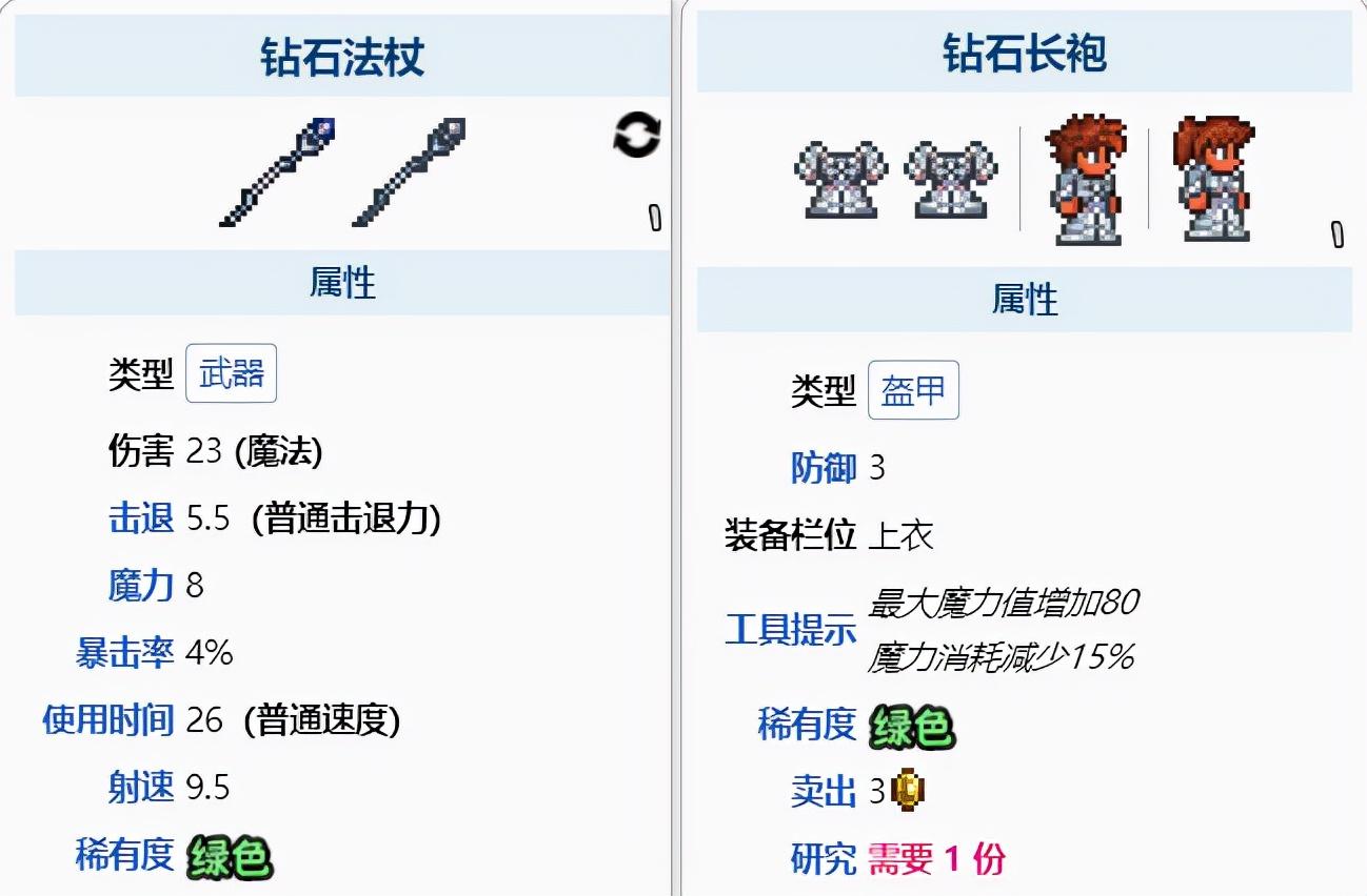 钻石制作出来的钻石法杖与钻石长袍,是所有宝石制作出来的物品中,属性最好的。钻石长袍提供所有宝石长袍中最多的魔力和魔力消耗减免。钻石法杖则是有着大量的伤害与十分不错的攻击速度,还能穿透一个敌人。