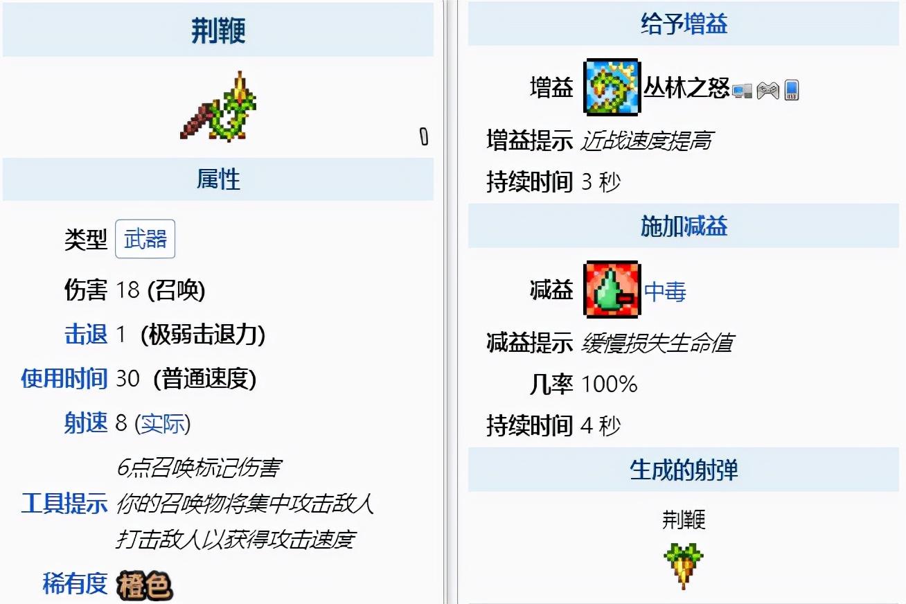荆鞭能够让召唤物集火攻击命中的角色, 并在击中怪物后,会提供一个三秒的攻速加成buff,并且还会让怪物中毒三秒。可以说是召唤师前期最好用的武器。而制作荆鞭需要12个毒刺、3个藤蔓与3个丛林孢子,需要玩家去丛林打怪才能获得。