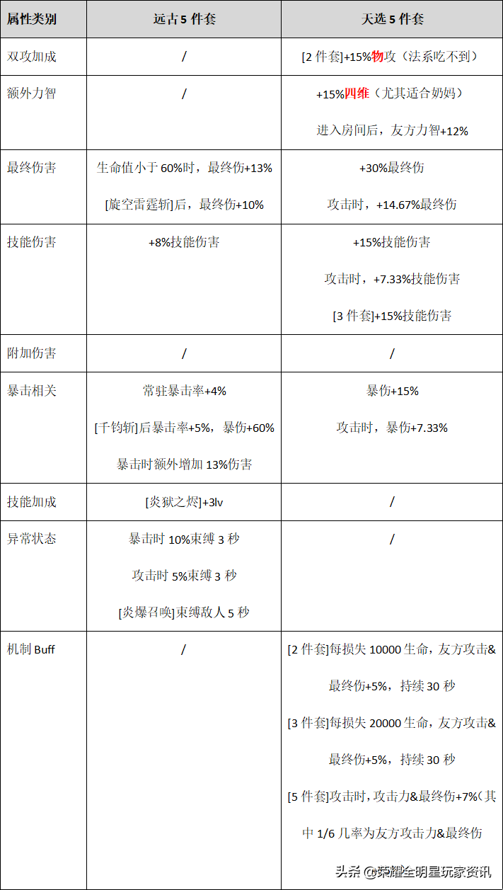 首先按照惯例,南瓜在这里先对天选5件套(非神谕)与远古职业套装(炎狱剑主)的性能进行制表对比: