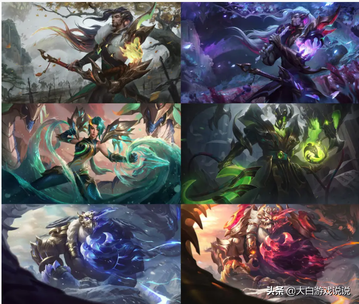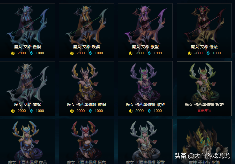 魔女伊芙琳、古神墨菲特、古神沃里克、魔女卡西奥佩娅、魔女阿狸、魔女艾希。每一个英雄都是人气英雄,炫彩配色虽然偏向深色,也是很值得一换的。