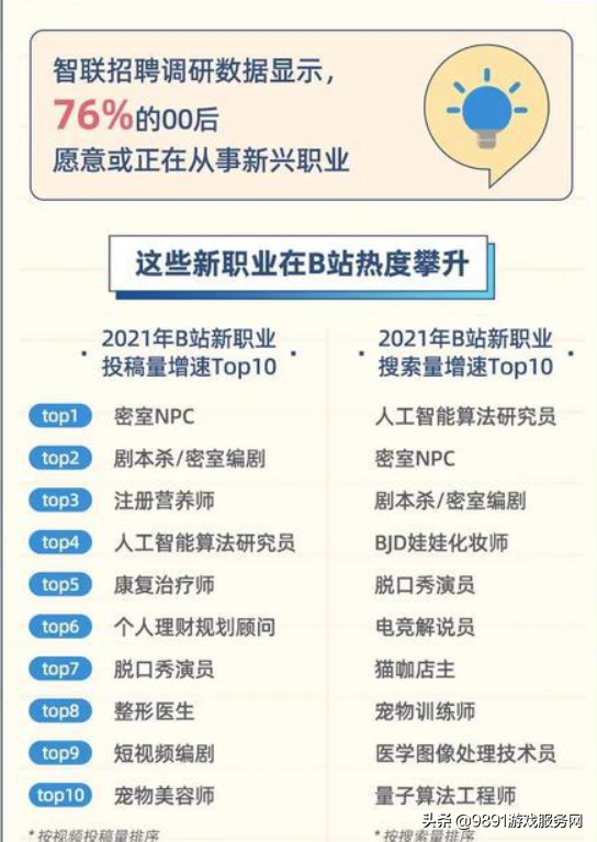 根据报告显示,在B站中最受关注的职业是“程序猿”,超过30%的00后希望今后能够从事互联网行业此外,关于创业、副业等相关视频数量也在B站迅猛上涨。在智联数据中显示,超过88%的00后愿意或在尝试灵活就业。