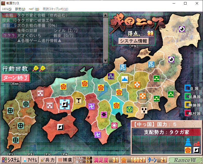 不过玩家扮演的可不是除了摸鱼就是钓鱼的王子,要完成建国伟业只是打打闹闹动用嘴上功夫难以做到,虽然有了这些为乱世添上光彩魅力的美少女角色更能提起干劲,但还有外忧内患亟待解决。所以治水开垦、振兴经济、规划内政等都需要合理安排,才能使领国变得富裕,建造城池,以防备他国的侵略做准备。当然,这里没有《文明5》里圣雄甘地一样的疯狂邻居,结盟也不失为扩大疆域的好手段。