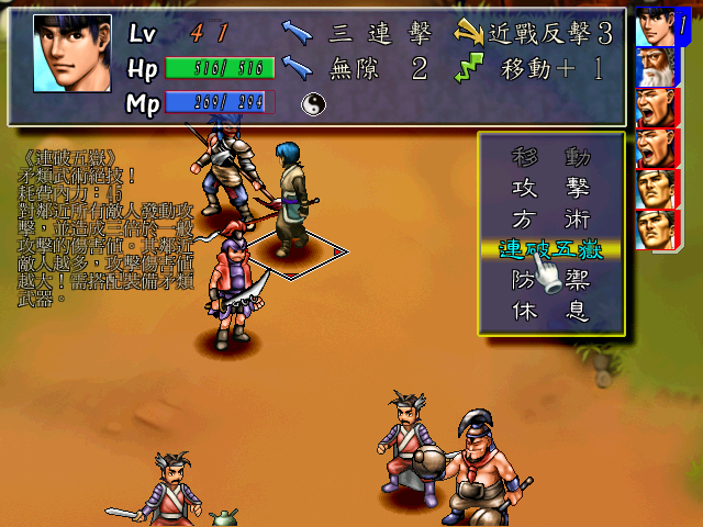 连破五岳是主角必须的技能之一,需要装备矛类武器才能使用,释放之后,可对临近所有敌人发动攻击,并造成3倍于一般攻击力的伤害值,而且附近敌人越多,伤害也就越高。这个技能简直是秒boss的神技,非常好用,经过测试,攻击力为550的主角,再加上蓄力集中的状态,一个技能就能带走华雄。要想学连破五岳也很简单,让主角多吃书就行了,最好把方术和武术技能都学会了,这招在技能表中出来了。
