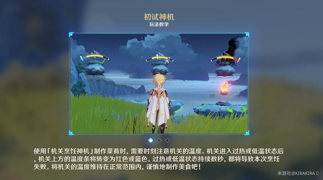 • 使用「机关烹饪神机」制作菜肴时,需要时刻注意机关的温度。机关进入过热或低温状态后,机关上方的温度条将转变为红色或蓝色。过热或低温状态持续数秒都将导致烹饪失败。