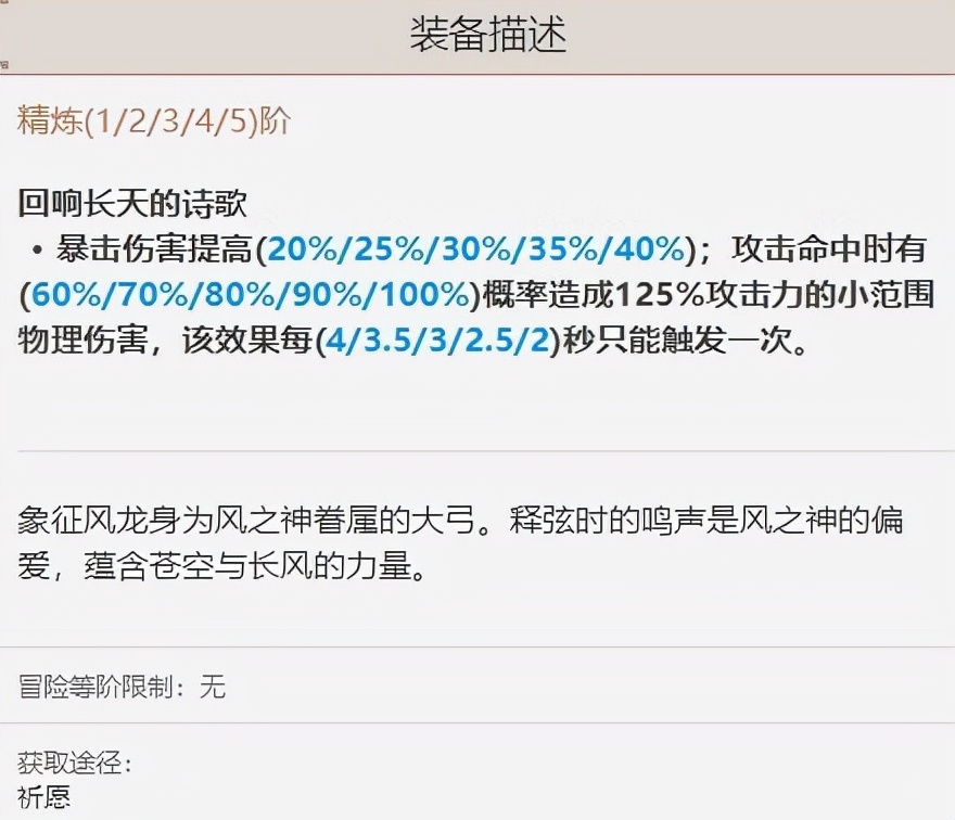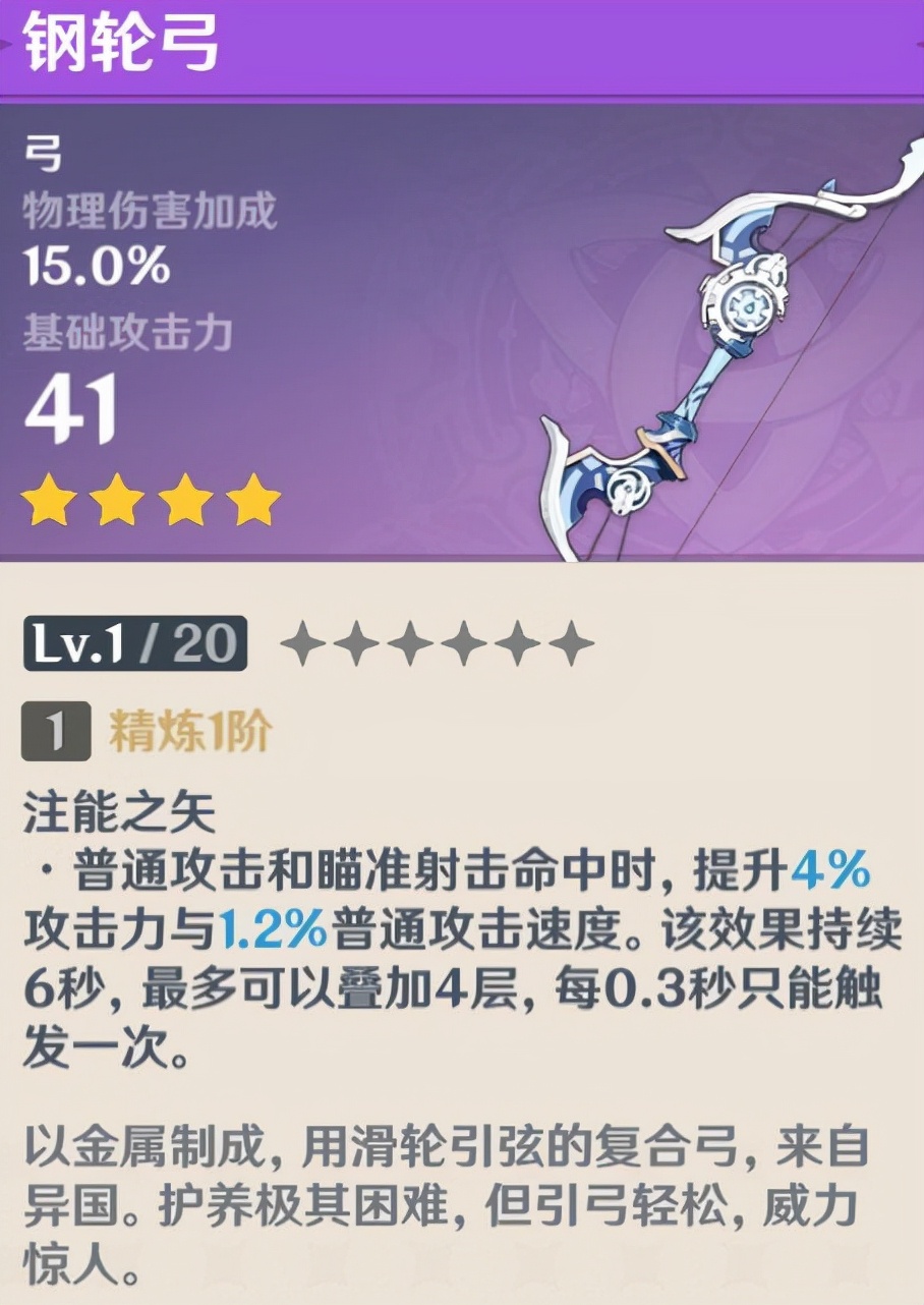 拥有不错的面板值,其中钢轮弓可以锻造,能够获得比较高的精炼度,相对平民一点,不像弓藏只能通过祈愿抽卡获取。