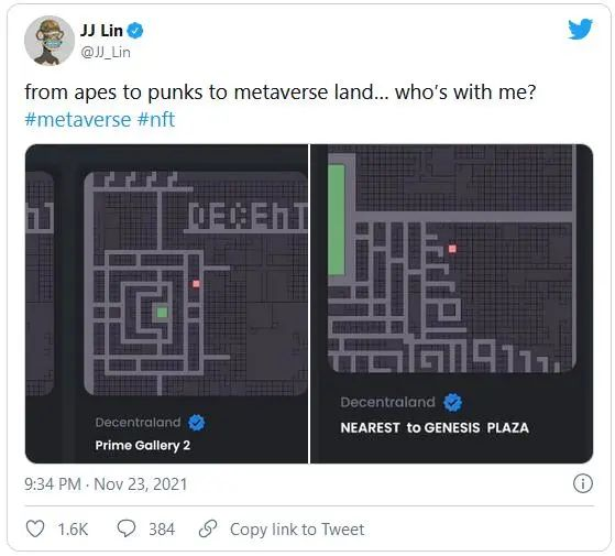 著名歌手林俊杰,在Decentraland平台上花了12.3万美元买了3块虚拟土地。
