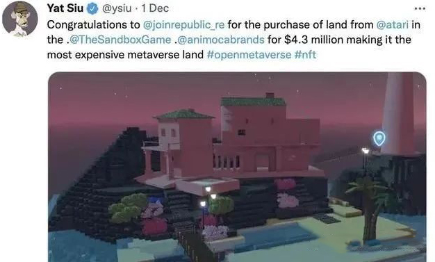 目前,元宇宙土地成交价节节攀升,The Sandbox上的一块虚拟土地,被虚拟地产开发商Republic Realm以430万美元的价格买下,折合人民币2700多万。