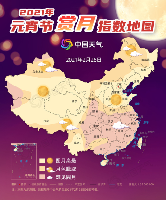 根据预报,元宵节(2月26日)当晚,吉林、辽宁、北京、天津、河北、山东、山西、青海、甘肃、云南、海南以及新疆南部、西藏北部等地天气晴朗,月明星稀,小伙伴们抬头即可观赏圆月;黑龙江、内蒙古西部、宁夏、河南等地的朋友可以看到“彩云追月”的美景;而陕西南部、四川东部、广西、广东、福建、重庆、贵州、湖南、湖北、江西、浙江、上海、安徽中南部、江苏中南部等地因为降水或云层较厚,无缘明月。