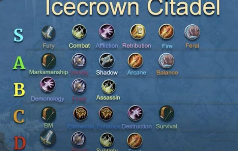 事实上萨满的DPS能力在WLK版本完全称不上优秀,这是国外网友统计的ICC团本的DPS排行天梯,可以看到无论是元素萨还是增强萨都排在C级,上面还压着整整3个等级。