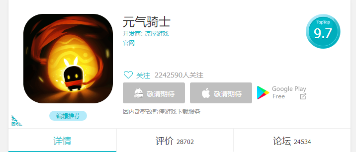 元气骑士手游操作简单有趣。游戏凭借开发者用心的在设计和精美的制作,在TAPTAP上短时间内获得了可以和绝地求生:全军出击相媲美的超200万用户的关注和9.7高分。可玩度五颗星!