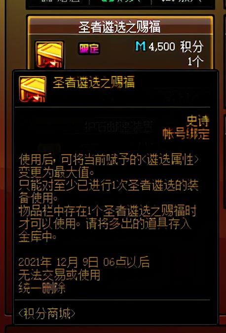 本期积分商城上架了圣者遴选之赐福,需要4500积分兑换,使用后可直接让一件遴选过的装备的遴选属性变更为最大值。