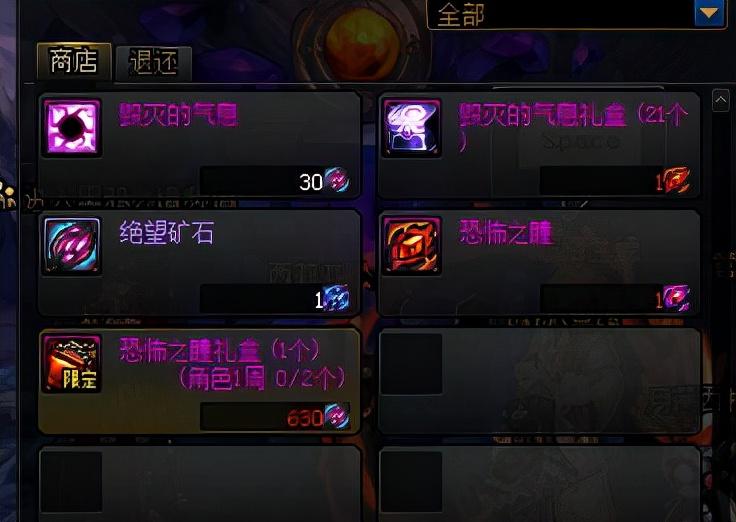 可在NPC朱蒂·灵伍德处花费630个绝望矿石兑换1个恐怖之瞳礼盒,每周每角色限定兑换两个。