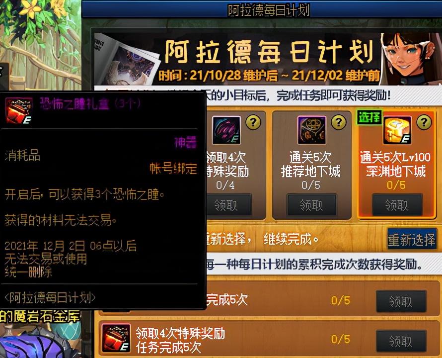 在刚刚上线的阿拉德每日计划活动中,累计领取4次特殊奖励即可获得恐怖之瞳礼盒,开启后可获得3个恐怖之瞳。