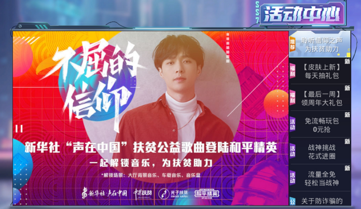 继周年庆火箭少女演唱的《On Fire》成为车载音乐后,《和平精英》最近又宣布新增车载音乐,这次是由张艺兴演唱的扶贫公益单曲《不屈的信仰》。张艺兴的新歌《不屈的信仰》是一首脱贫攻坚决胜之年的鼓舞歌曲,充满了奋斗的正能量,而腾讯光子工作室群更是这次扶贫活动的公益支持方。