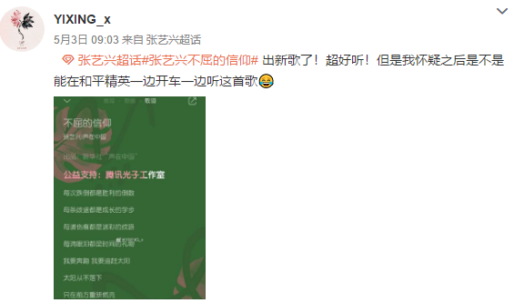 张艺兴这首歌一上线就受到众多好评,粉丝们都跟小编一样开启了单曲循环。不过不知道大家有没有发现在歌词里出现的腾讯光子工作室群呢?虽说是作为公益支持署名,但还是有不少张艺兴粉丝在歌曲刚发布的时候,觉得事情绝没有那么简单,猜测腾讯光子工作室群也许会把新歌作为车载音乐。