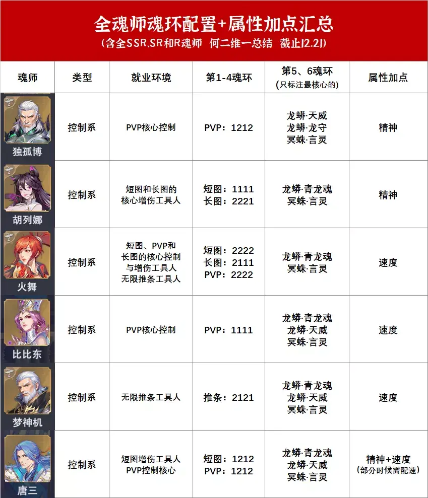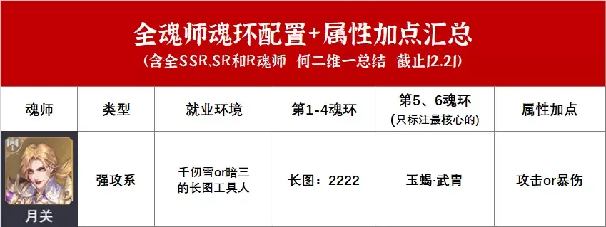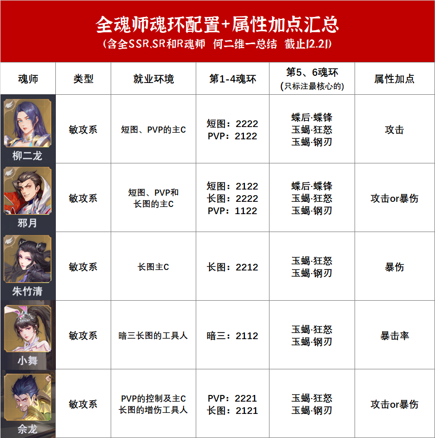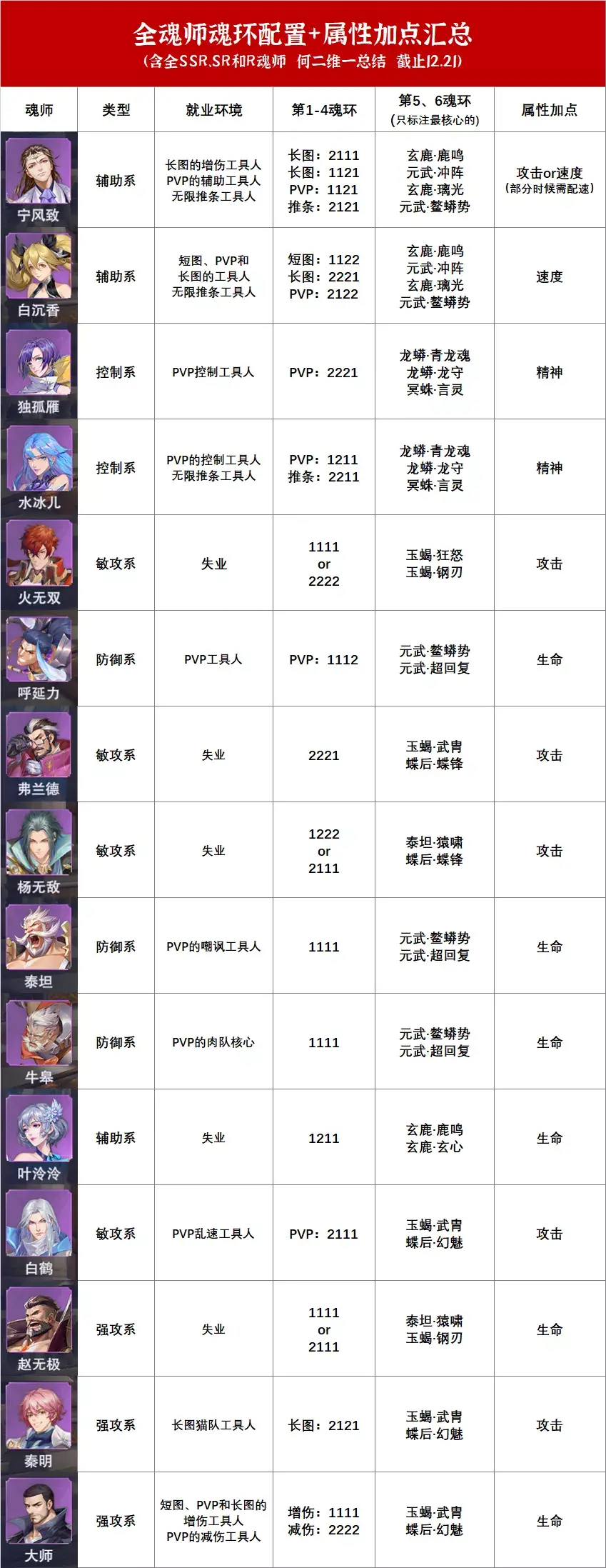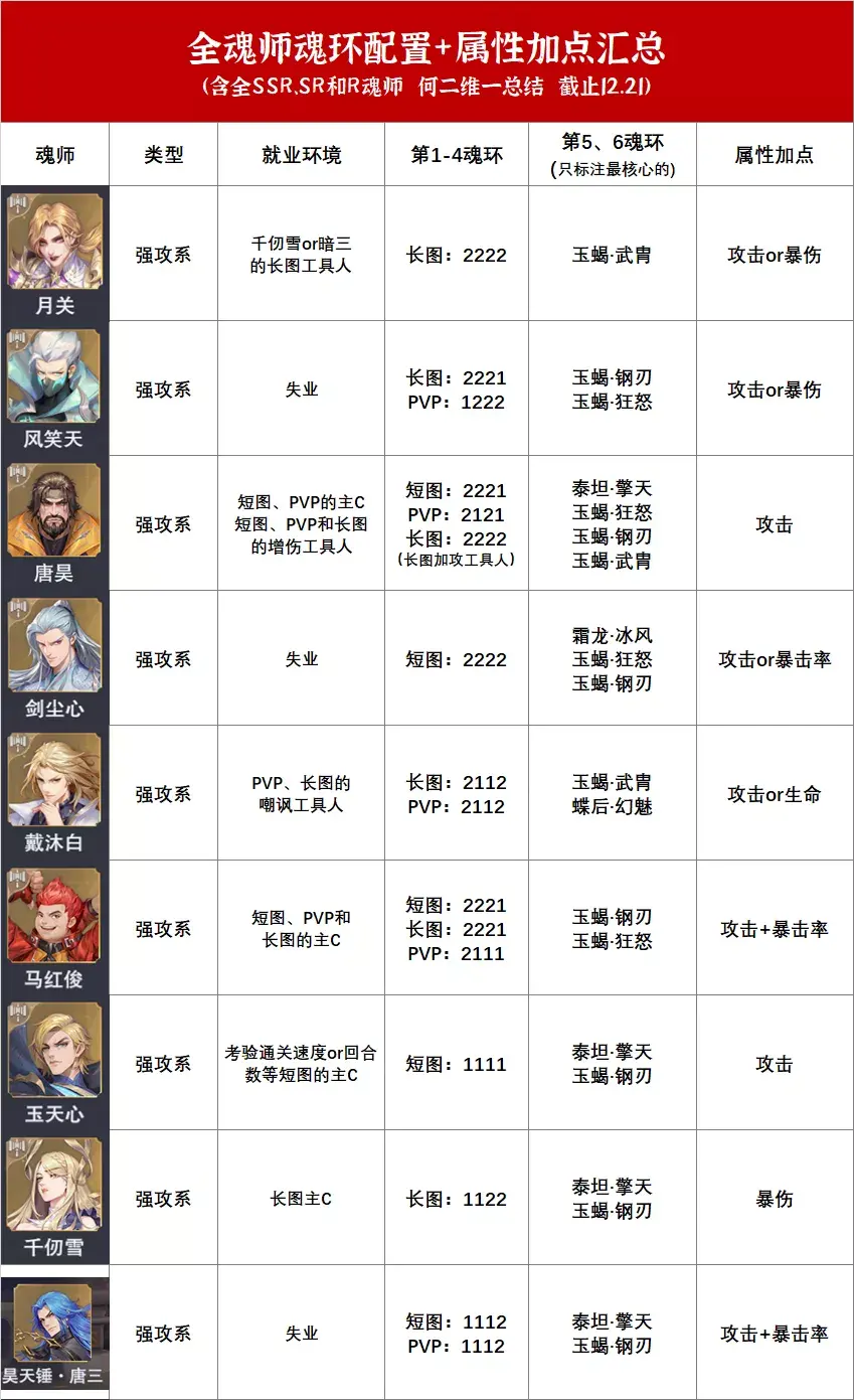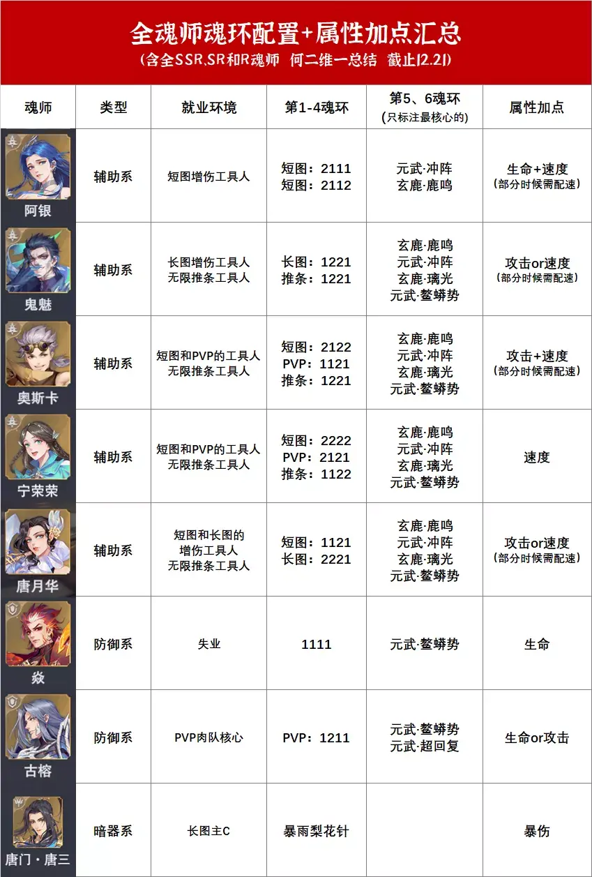 距离我们上次总结全魂师的魂环、加点汇总攻略已经过去了近2个月的时间,期间不少魂师的技能、就业环境也出现了较大的变化,同时伴随着暗三、蛇矛斗罗等新SSR魂师的上线,我们的汇总攻略也急需更新,因此今天的文章维一便给大家带来了2021年度最后的一篇魂环、加点和玩法汇总攻略,希望能给大家带来一些帮助!