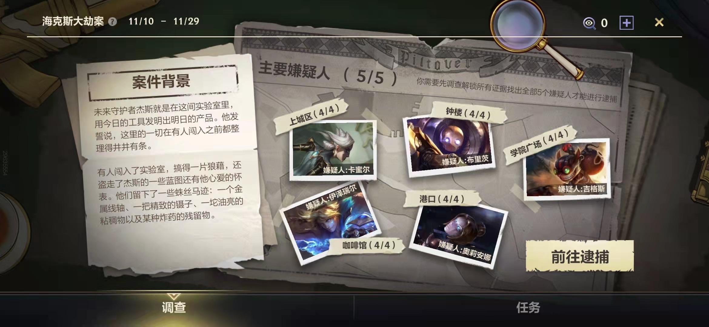 昨天已经11月23日了,海克斯大劫案活动最后一阶段任务也更新了。大部分玩家应该都陆续完成了最后一阶段的任务,获得了足够的调查点。