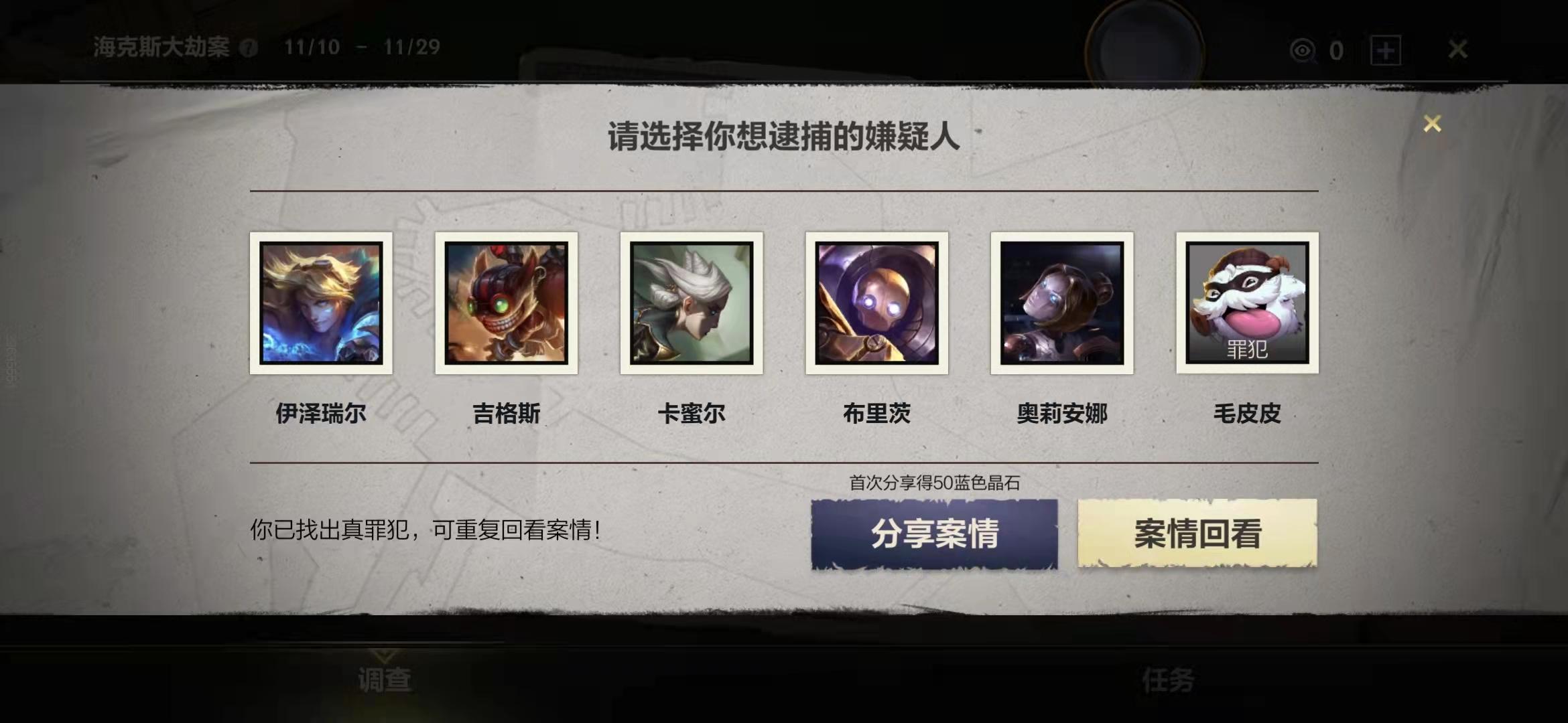 最后确定的嫌疑人共5位,分别是卡密尔、伊泽瑞尔、布里茨、奥莉安娜和吉格斯。活动的最后我们需要根据线索来确定谁是凶手。值得注意的是,在确定凶手的界面,有6个选项,最后一个是凶手另有他人。(其实是可以多次选择的)