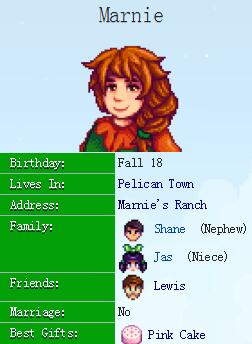 玛尼Marnie(昵称牧场大妈)是一个玩家们经常需要打交道的npc,并且有一个十分重要的任务的任务物品就在玛尼的家中,因此和玛尼打好关系可以说是非常有必要的,为了不剧透就先不告诉大家是什么物品了,总之她的好感度是必须优先刷起来的