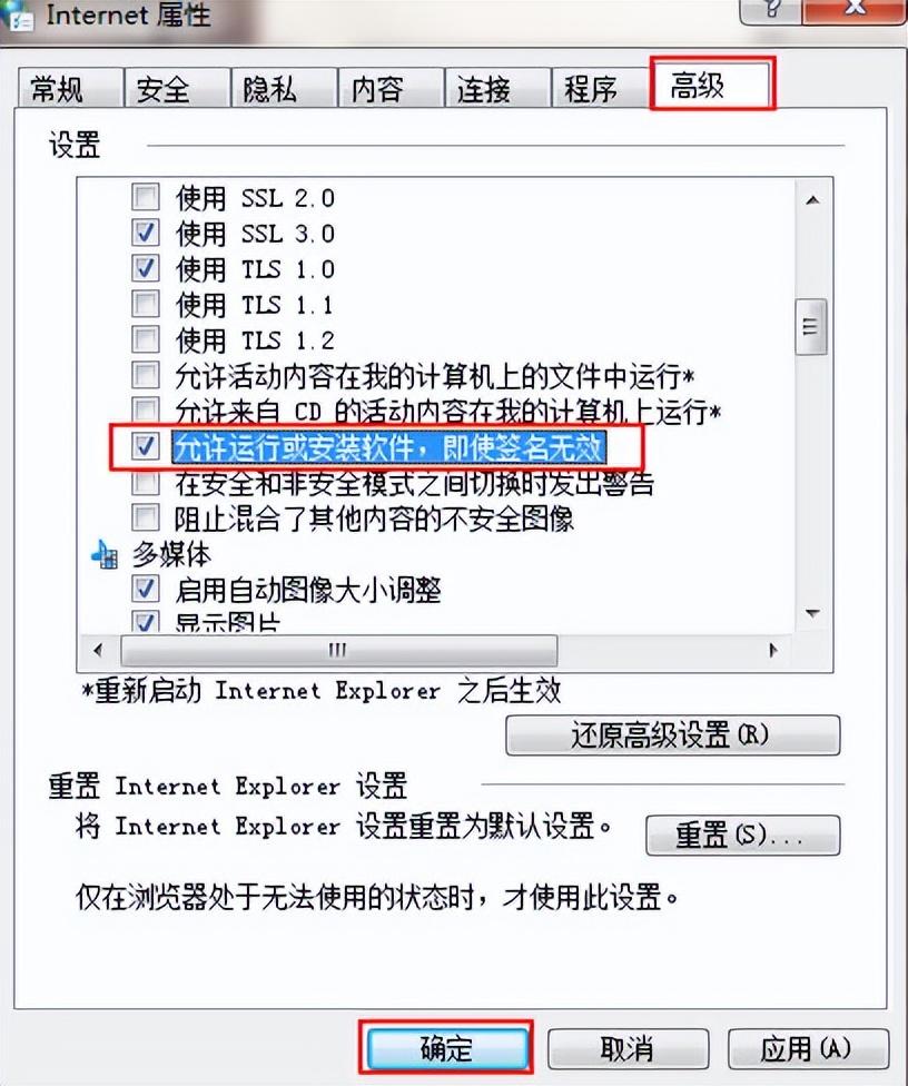 4、切换到高级栏,勾选“允许运行或安装软件,即使签名无效”,点击确定按钮,如下图所示: